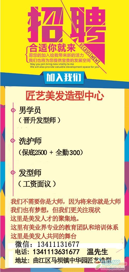 正文摘要:我們不需要你是大師,因?yàn)閷砟憔褪谴髱? 我們也有夢想,但我們更關(guān)注現(xiàn)狀 這里是美發(fā)人才的聚集地 這里有美發(fā)界專業(yè)的教育團(tuán)隊(duì)和培訓(xùn)體系 這里是美發(fā)人共同的舞臺(tái) 上班時(shí)間:早上十點(diǎn)---晚上十點(diǎn) 月休三天, ... |